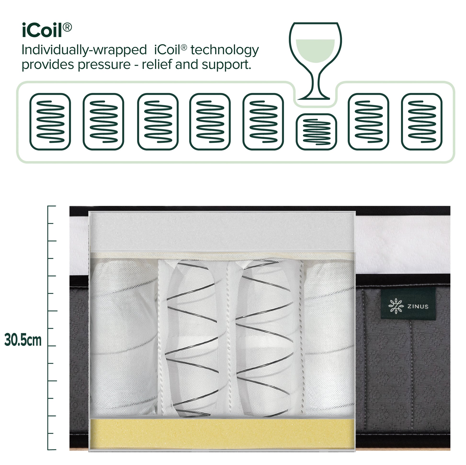 This 30cm Euro Top Spring Mattress by Zinus features hundreds of independent iCoil® Springs, providing customised support while minimising motion transfer for uninterrupted sleep. The stable support layer is the 7.5” iCoil® Pocketed Springs. It provides stable support, keeping you aligned and pressure free for a great night's sleep. The foam layers above the iCoil® Springs adjust to your body to give you a customized, comforting, sleep surface. This unique combination of iCoil® Springs along with comforting foam layers will help you sleep well and wake up refreshed. Please open your mattress package within 72 hours of receipt and allow 48 hours for your new mattress to return to its original, plush shape. Another comfort innovation from Zinus. Pioneering comfort.